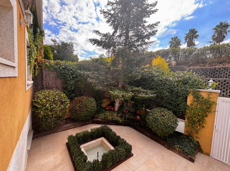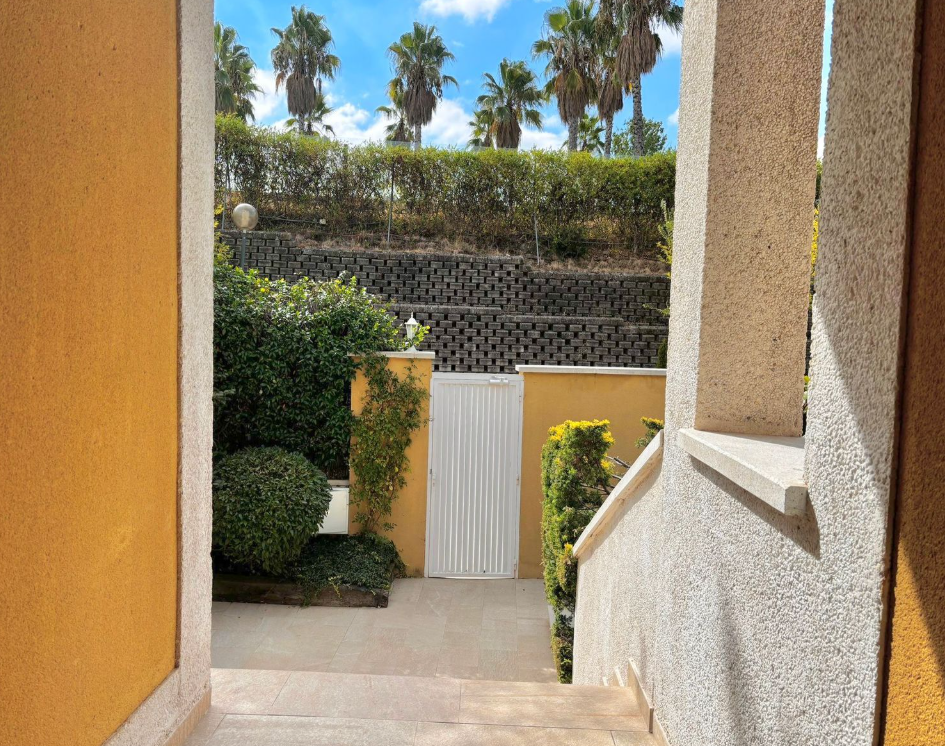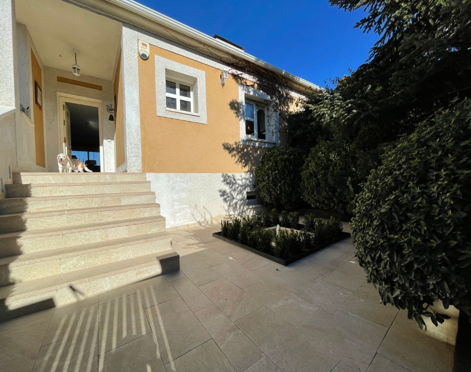 El jardín solado que rodea toda la casa está recientemente renovado, dispone de zona de vestuario y baño.