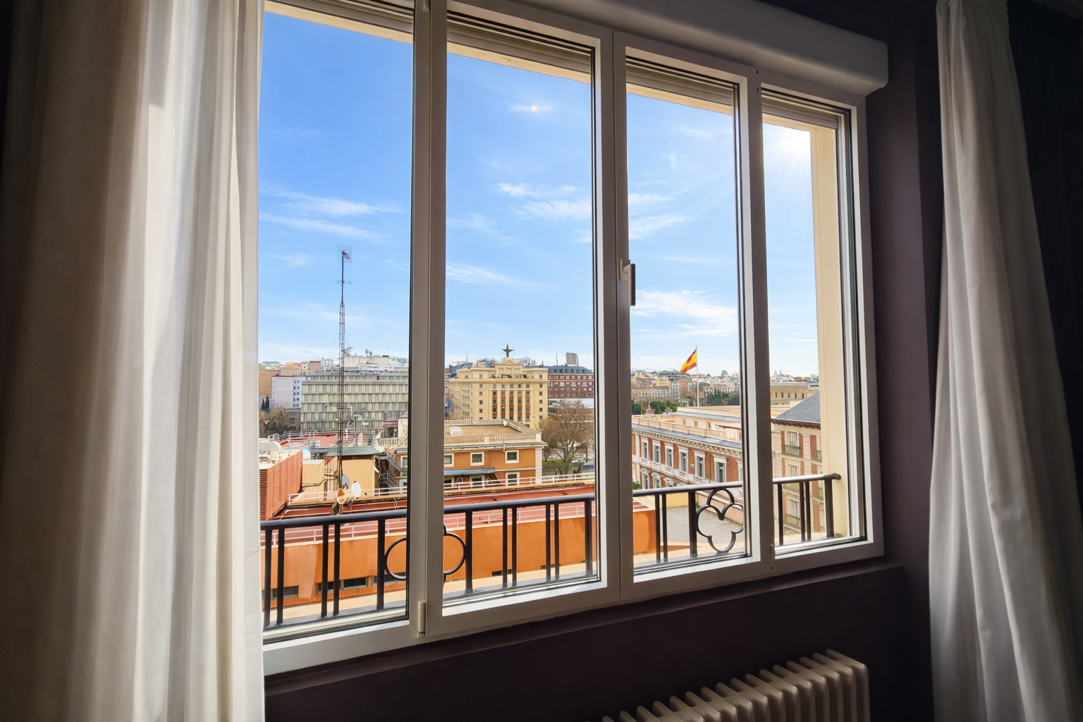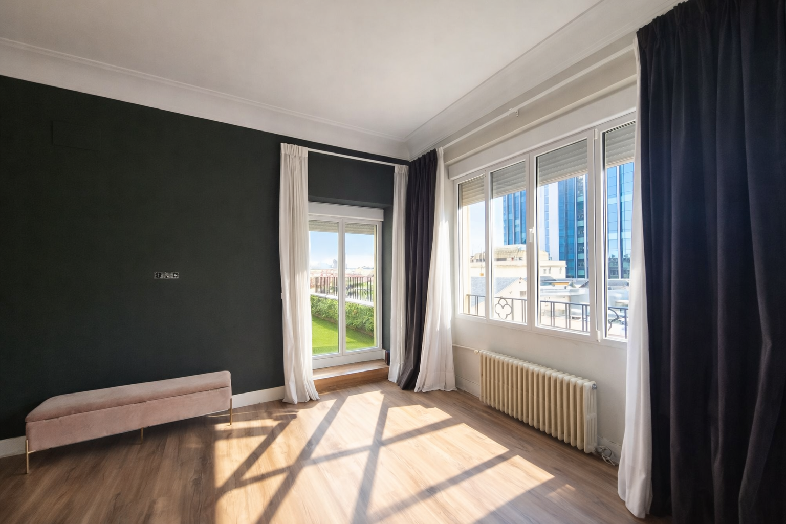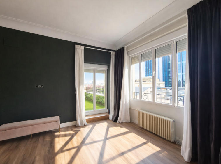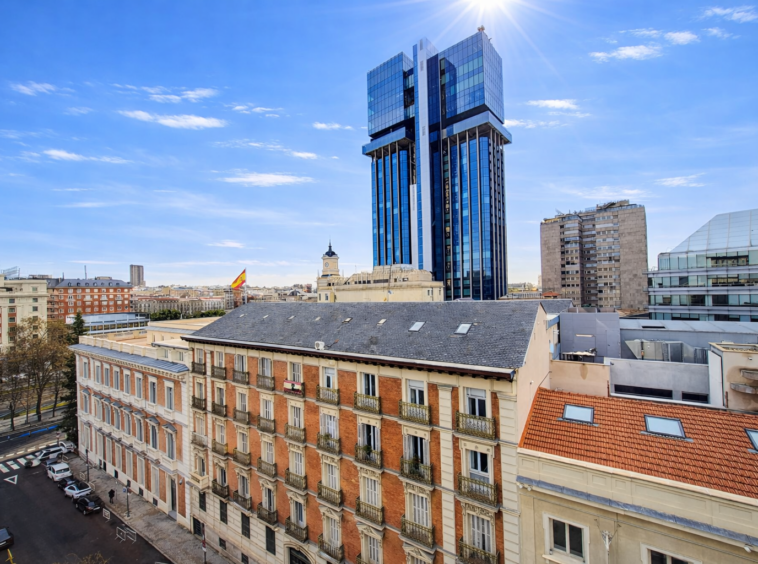 Uno de los salones hace esquina y tiene preciosos ventanales en curva con unas vistas espectaculares de Madrid.